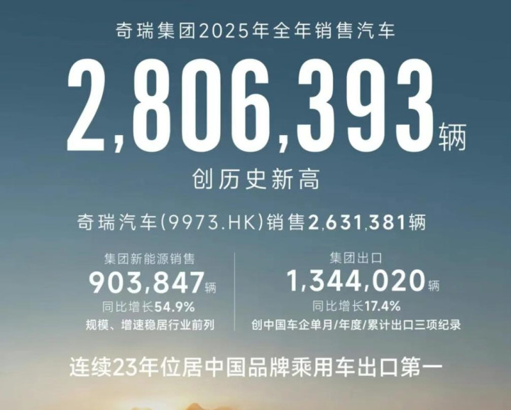 奇瑞2025年全年销量280.6万辆,同比增长7.8%。其中,出口134.4万辆,蝉联中国汽车第一,新能源全年销量突破90万辆,同比增长54.9%。不过,全年销量完成率仅为 86.1%,在此基础上,奇瑞吸取教训,今年销量目标较于2025年的326万反而有所下调。